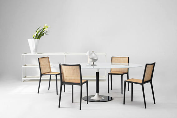 Palomba & Serafini propusieron para Kartell la silla Belvedere que, gracias al uso del mimbre en las zonas de apoyo, reinterpretan en clave contemporánea la silla de café vienesa, combinada con materiales reciclados.